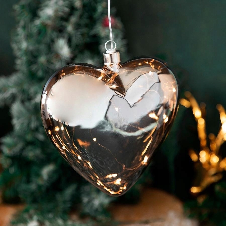 Dekoracja szklana LED 15, serce z gwiazdkami Świąteczna ozdoba wyposażona w lampki LED o ciepłej barwie, wprowadzi odpowiedni nastrój. Możliwość zawieszenia w dowolnym miejscu domu. Funkcjonalna - sprawdzi się jako lampka nocna w pokoju dziecięcym. Dekoracja w kształcie serca w wymiarze 18 cm. kolorze srebrnym, zawieszona na kablu o długości 60 cm. Wewnątrz serca znajduje się 15 lampek LED o ciepłej barwie.